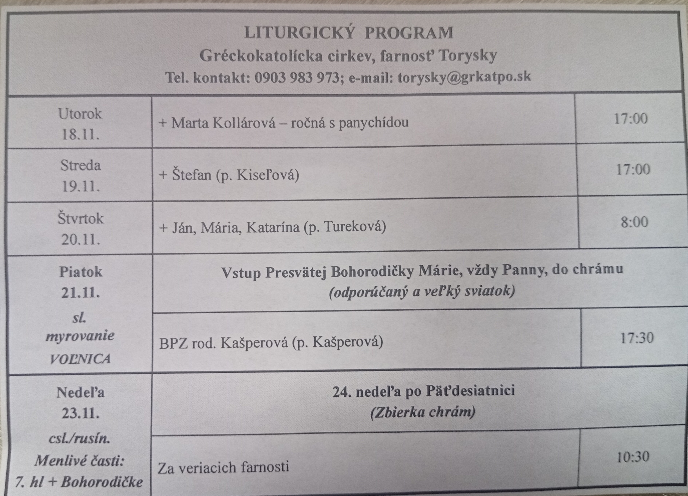 Liturgický program od 17.11. do 23.11. 2025, farnosť Torysky