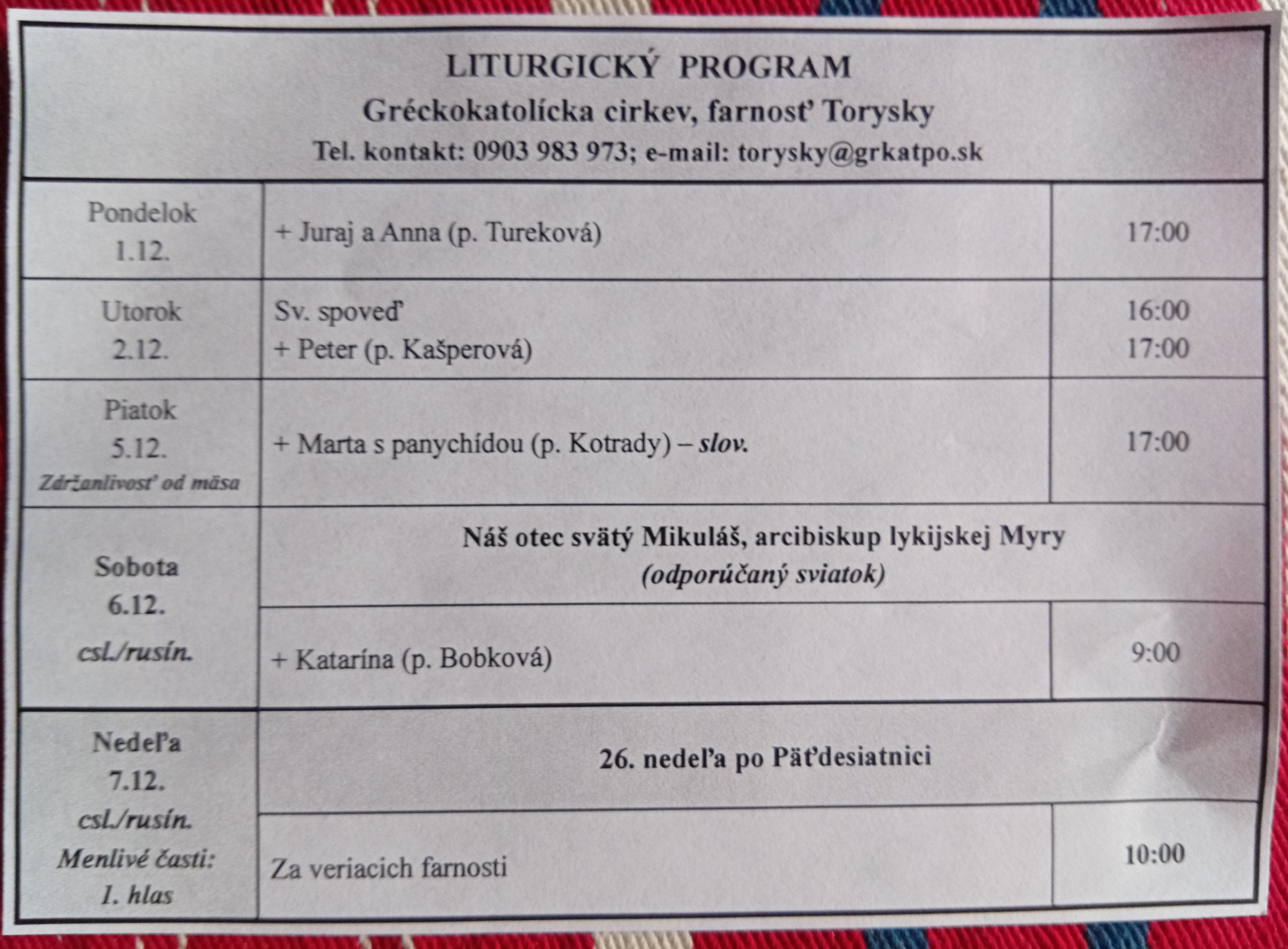 Liturgický program od 01.12. do 07.12.2025, farnosť Torysky