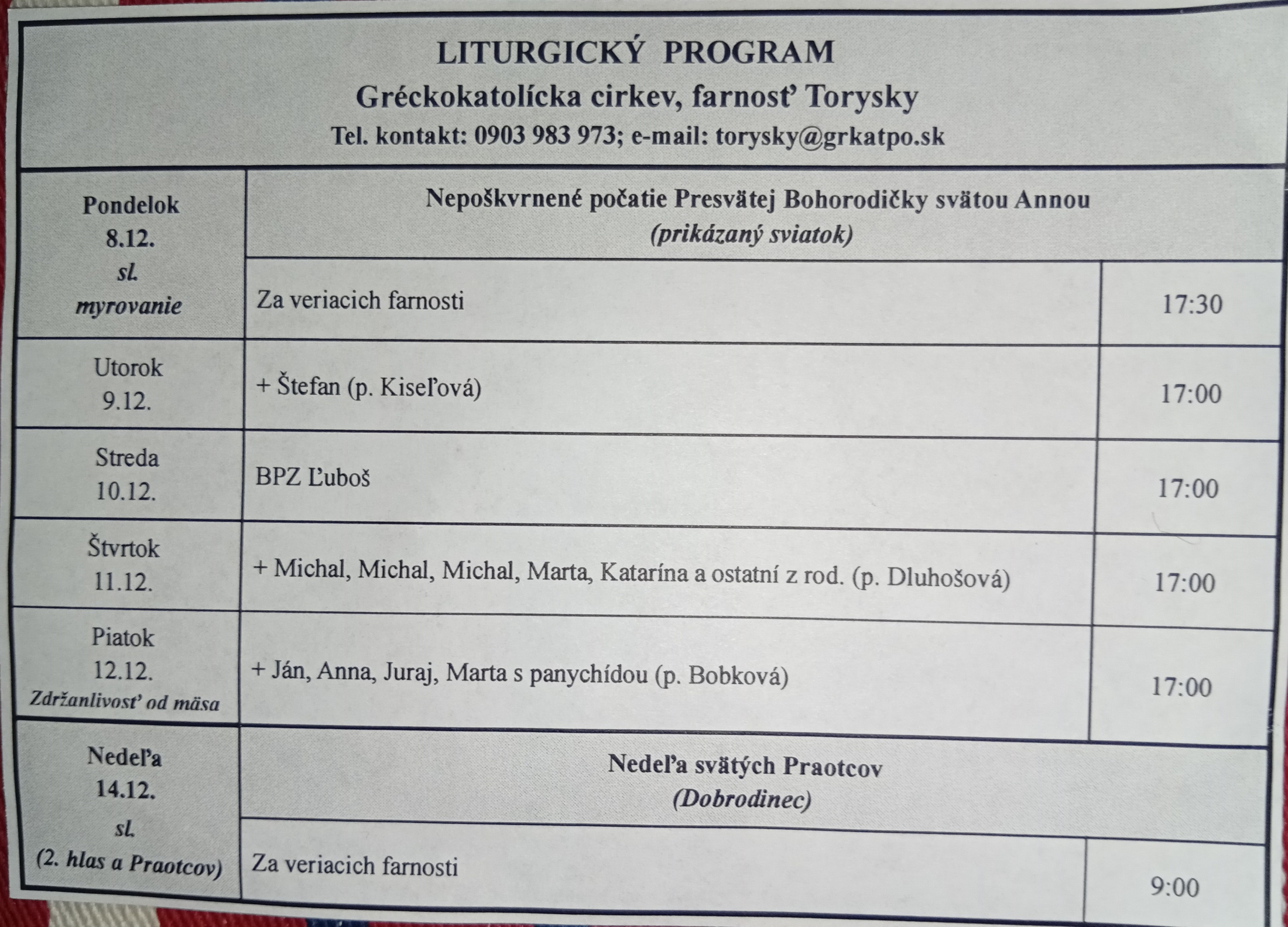 Liturgický program od 08.12. do 14.12.2025, farnosť Torysky