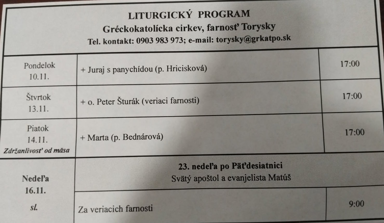 Liturgický program od 10.11. do 16.11., farnosť Torysky