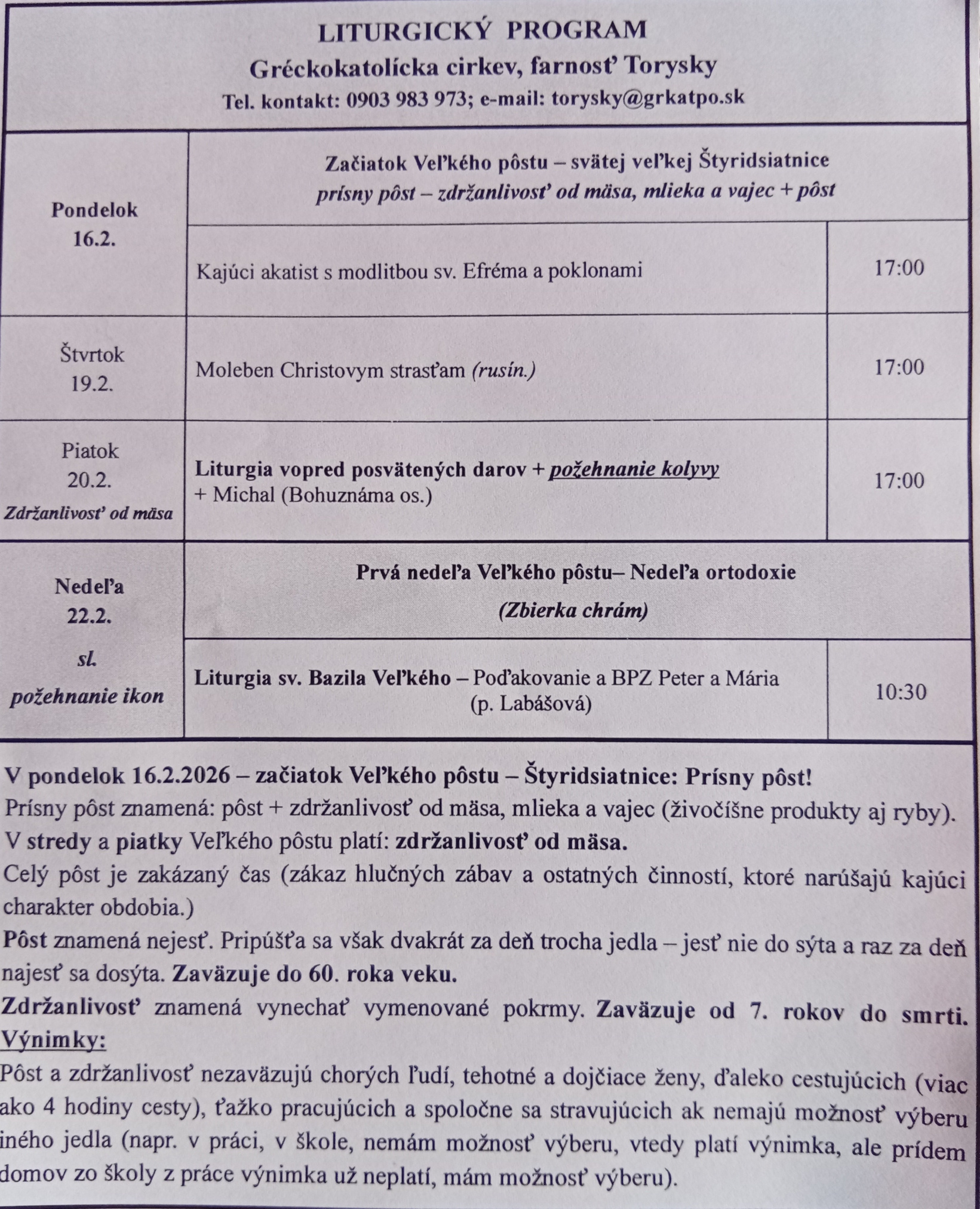 Liturgický program od 16.02 do 22.02.2026, farnosť Torysky