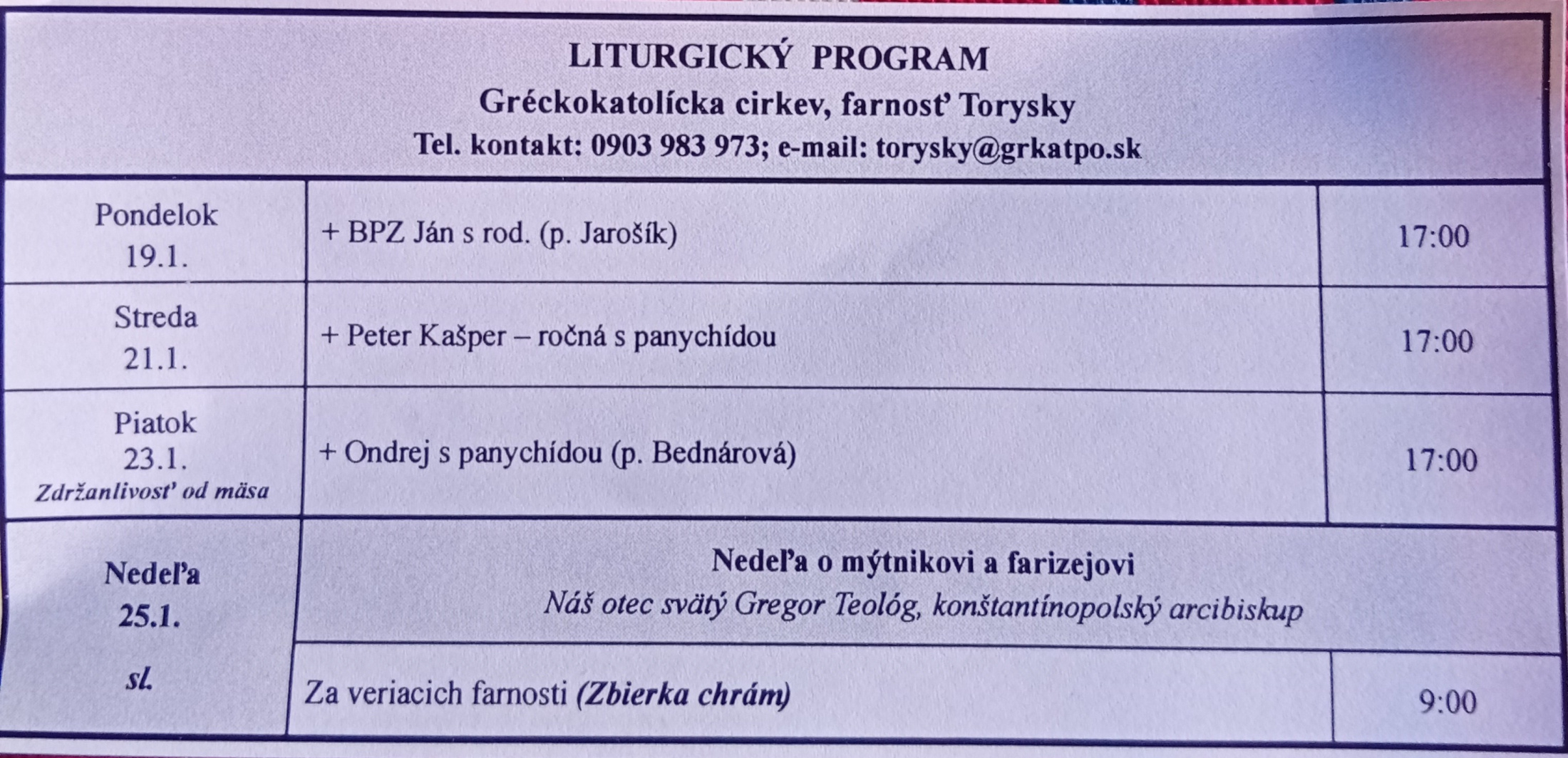 Liturgický program od 19.01. do 25.01.2026, farnosť Torysky