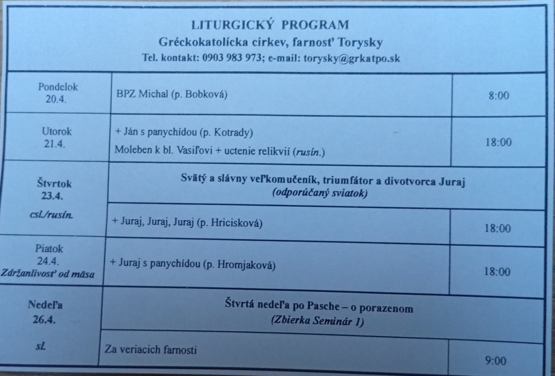 Liturgický program od 20.04. do 26.04.2026, farnosť Torysky