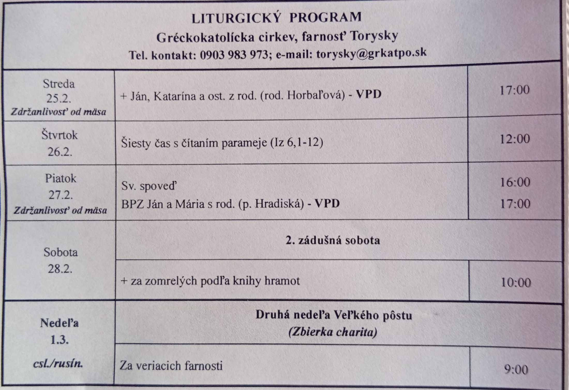 Liturgický program od 16.02 do 22.02.2026, farnosť Torysky