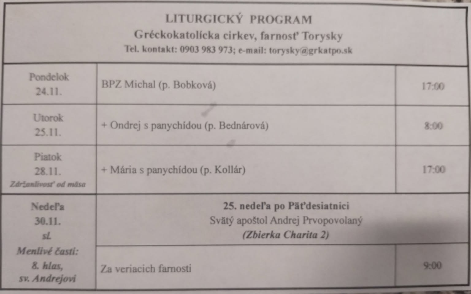 Liturgický program od 17.11. do 23.11.2025, farnosť Torysky