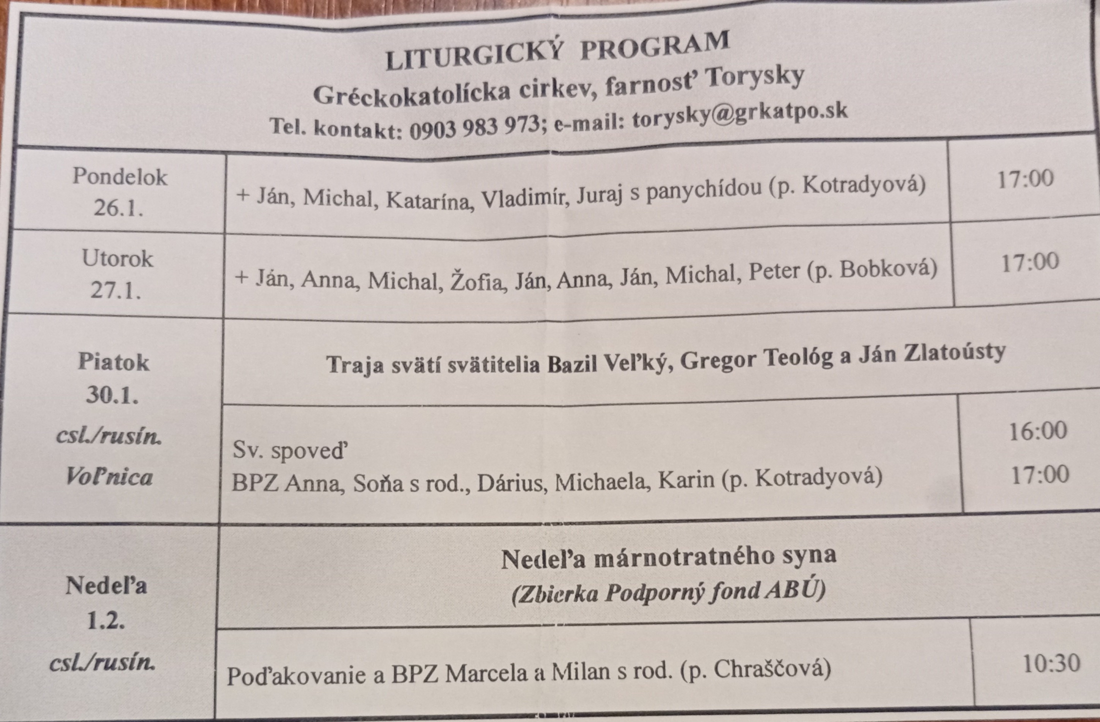 Liturgický program od 19.01. do 25.01.2026, farnosť Torysky