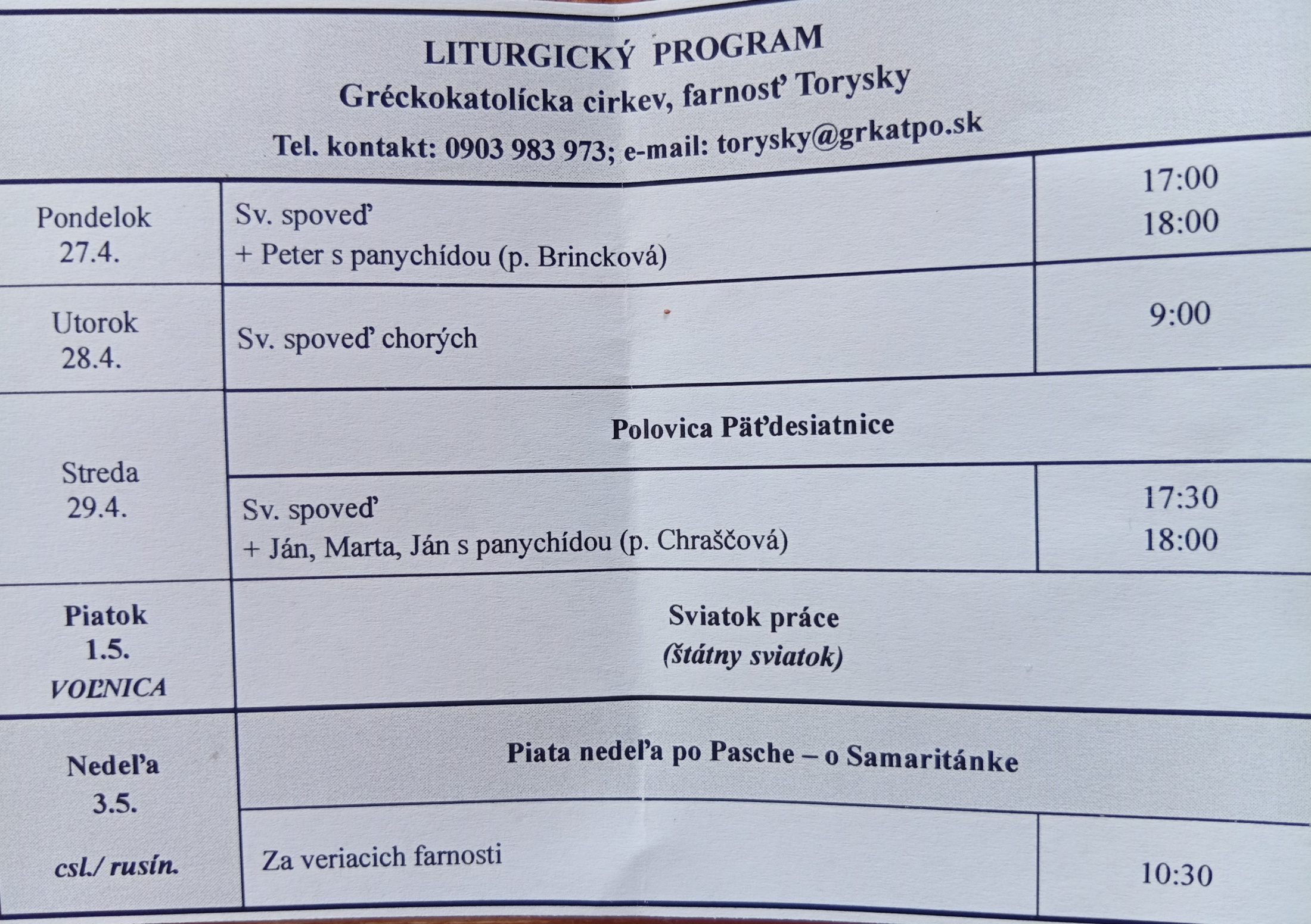 Liturgický program od 27.04. do 03.05.2026, farnosť Torysky
