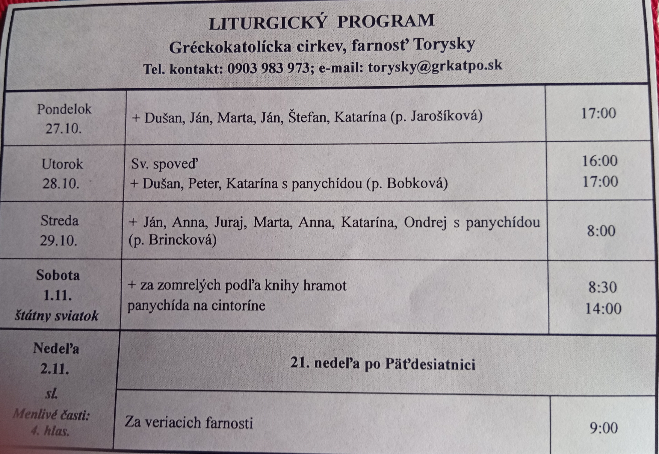 Liturgický program od 27.10. do 02.11.2025, farnosť Torysky