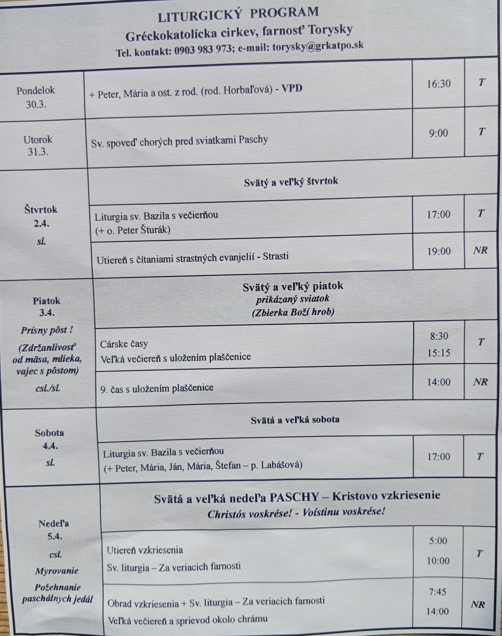 Liturgický program od 30.03. do 05.04.2026, farnosť Torysky a N. Repaše