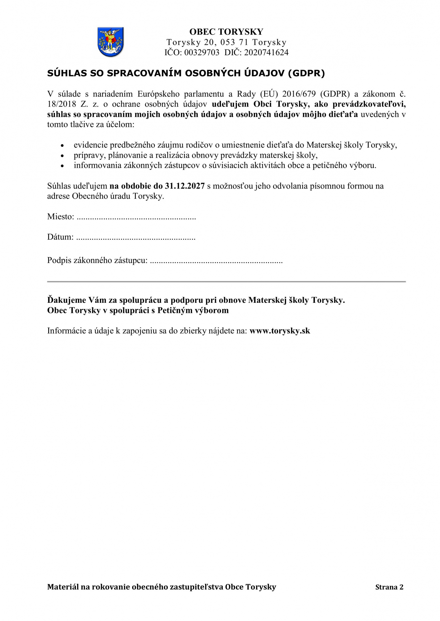 Na základe rokovania OZ v Toryskách dňa 13.11.2025 zverejňujeme tlačivá pre dobrovolníkov a záujemcov o umiestnenie detí do MŠ Torysky. Tlačivá nájdete aj na https://www.torysky.sk/tlaciva