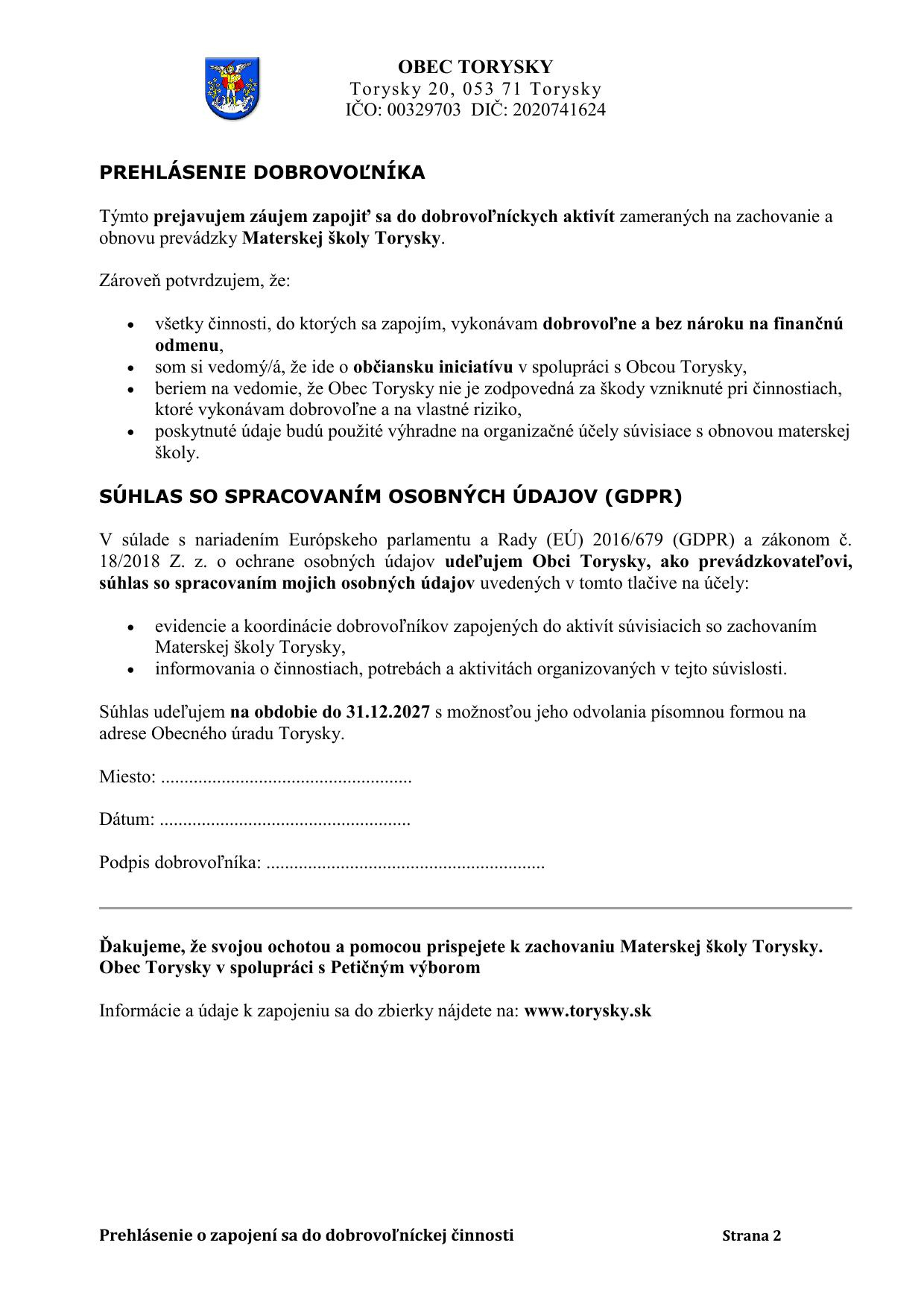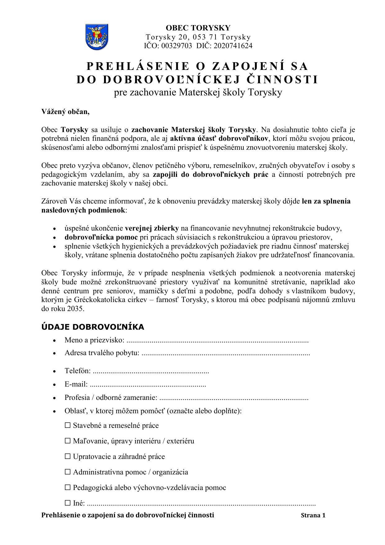 Tlačivá pre dobrovoľníkov a záujemcov o umiestnenie detí do MŠ Torysky