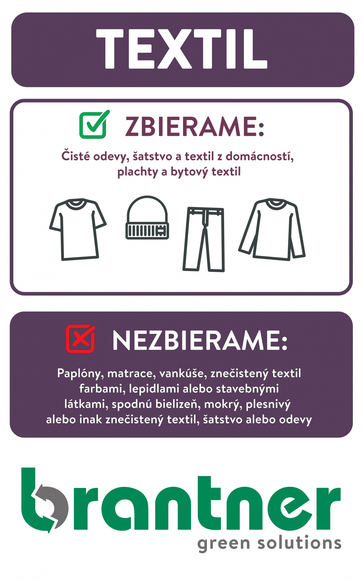 V čase zmenených úradných hodín môžete na obecný úrad doniesť do 13.10.2025 do zberu nepotrebný textil. Na plagáte nájdete informácie čo do zberu textilu patrí a čo nie. Podmienkou prevzatia textilného odpadu sú uhradené poplatky za TKO.